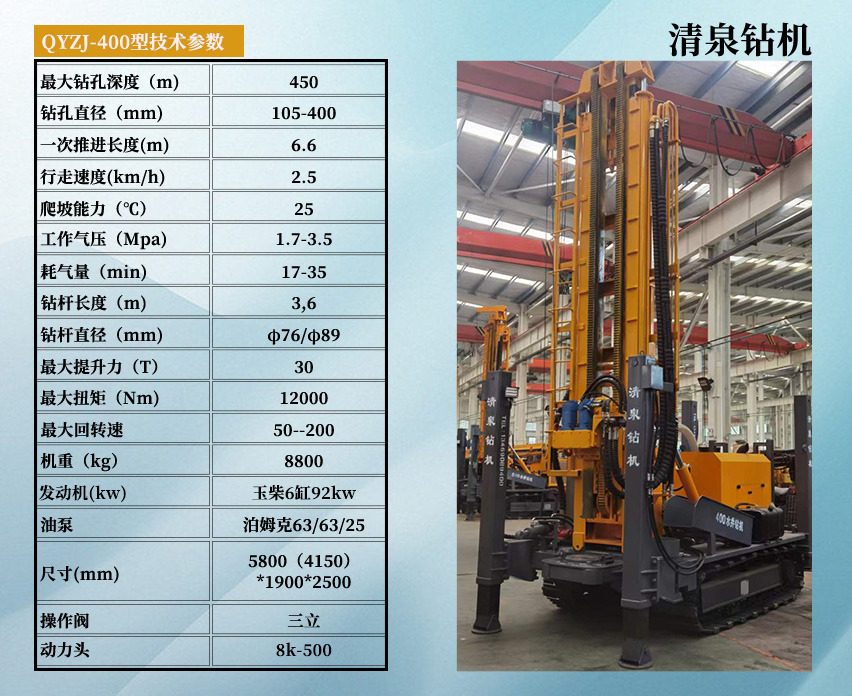 清泉400型潛孔水井鉆機(jī) 發(fā)動(dòng)機(jī)功率:玉柴股份六缸92千瓦。 油泵:美國泊姆克。 動(dòng)力頭馬達(dá): BM6-390。 最大扭矩: 12000 扭米+ 最大提升力: 30噸。 操作閥:三立。 整機(jī)機(jī)重: 8.8噸。 尺寸:長5.8米(底長4.15米),寬1.9米,高2.5米。 鉆孔直徑: 105-400 毫米。 鉆桿直徑:中76/φ89(3米)。 一次性推進(jìn)長度: 6600 毫米。